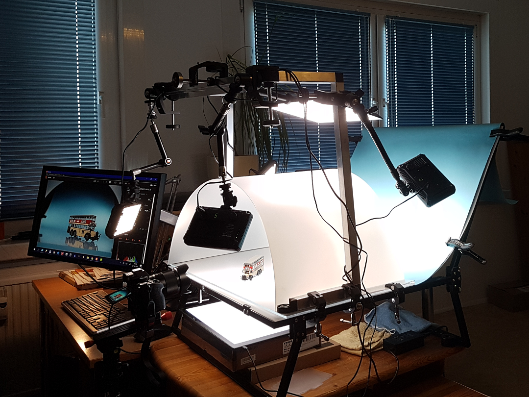 Andere verwenden offenbar lieber Tageslicht weil Kunstlicht immer die Farben verändere. Nun ja, Tageslicht ändert sich mit der Tageszeit. Und vor allem zu der von mir für diese Aufnahmen bevorzugten Nachtzeit sieht es zumindest in unseren Breiten mit Tageslicht ziemlich mau aus. Mein Fototisch erlaubt eine frei regelbare Beleuchtung mit 5500 K Tageslicht aus allen Richtungen. Ich versuche damit Kanten und Strukturen der ja meist recht monoton gefärbten Modelle besser sichtbar zu machen.